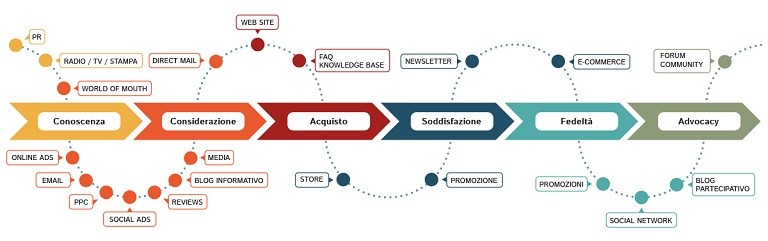 Ogni azienda che voglia lanciare un business online deve tenere in considerazione il Customer Journey, ovvero l’itinerario che ogni cliente percorre dal primo contatto con l’azienda fino alla decisione di acquisto, il percorso cognitivo che porta il consumatore attraverso diverse interazioni e diversi canali – online e offline – all’acquisto di un prodotto o di un servizio. L’azienda dovrà presenziare ogni fase di questo percorso con i tempi, modi e mezzi più opportuni, dall’acquisizione di lead e prospect fino alla retention.