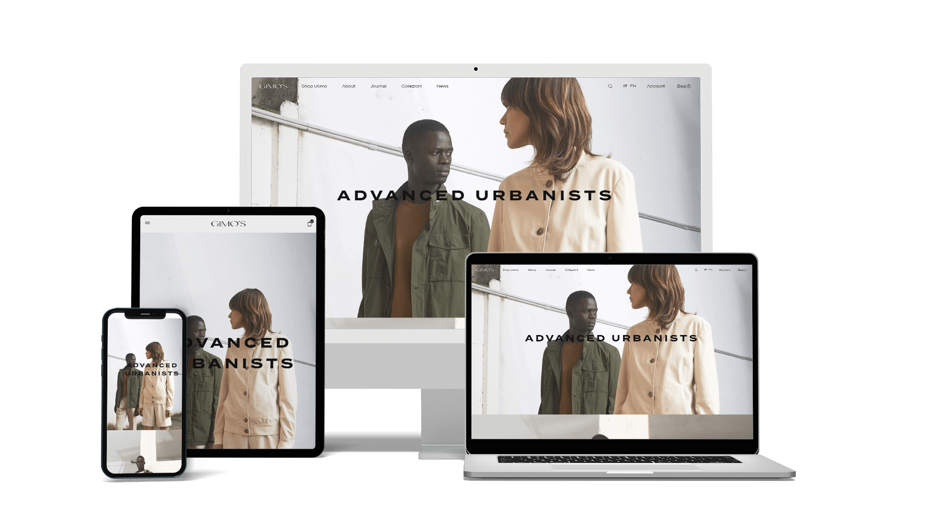 Per Gimo’s, Aeffe Lab ha realizzato un sito contemporaneo ed elegante, sviluppato su misura: immagini e grafiche si alternano nella home page, conferendo al sito un design dal carattere sartoriale e minimalista. La forte brand identity legata al concetto dell’”advanced urbanist” è esaltata da alcuni dettagli come l’alternanza di testi e foto di forte impatto, l’utilizzo del bianco e nero come unici colori del sito, le icone dallo stile pulito e ricercato, tutto sviluppato su di uno stesso piano comunicativo. Tutte le principali categorie del sito sono immediatamente fruibili dal menu principale, realizzati in ottica mobile first. All’interno del menu è possibile trovare, oltre alla categoria che parla del brand, anche quelle relative a blog e presentazione delle collezioni.